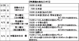 | 3/29 | 日曜日 | 受難の主日(枝の主日) | 前土曜18:00日本語 7:00/10:00日本語 |