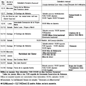 ■Calendario de diciembre■ El domingo 11 de Enero después de la Misa de10:00(Misa Internacional)  se bendecirá a los jóvenes que cumplen 20 años Por favor, inscríbase en la oficina el domingo 28 de diciembre.