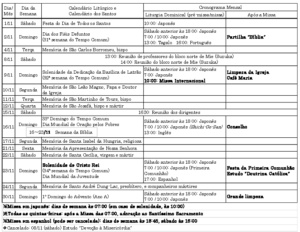 Sábado 7: 00 ~, PM 6: 00 ~ Domingo 7: 00 ~, 10: 00~ Tagalog :1°domingo PM 1: 00 ~ Portugués :1°domingo PM 4: 00 ~ Inglés : 3°domingo PM 1: 00 ~ Español : 4º domingo 0: 00 ~ (17: 00 ~)