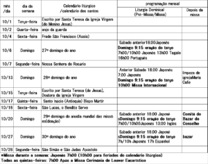- Haverá um Bazar no dia 27 de outubro após a Missa das 10:00