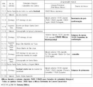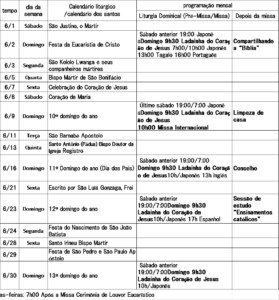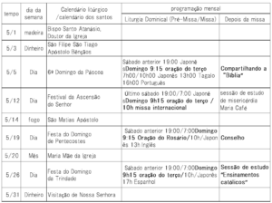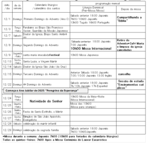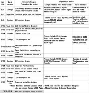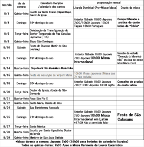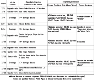 | Missa durante a semana: 7h00 Japonês Todas as quintas-feiras: 7h00 Após a Missa Cerimônia de Louvor Eucarístico |